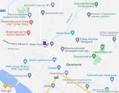 м. Васильків, вул. Грушевського, 2, за 100м до відділення ПУМБ та автобусної зупинки, за 150м до Васильківського Міськрайонного центру зайнятості, за 200м до магазину "Сільпо" та "COMFY", за 300м до повороту на вул. Гоголя, за 350м до повороту на вул. Дек