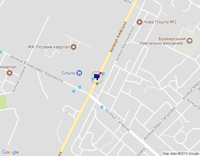 м. Бровари, вул. Київська, 294, навпроти магазину "Сільпо" та автобусної зупинки, за 70м до перехрестя з вул. Гагаріна та вул. В'ячеслава Чорновола