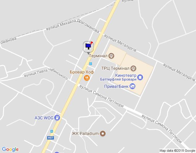 м. Бровари, вул. Київська, навпроти ТРЦ "Термінал" та магазину "МегаМаркет", навпроти АЗС "КЛО", за 155м до розвилки з вул. Павла Чубинського та вул. Симона Петлюри, за 305м до повороту на вул. Василя Стефаника, за 325м до АЗС "WOG", через 120м після повороту на вул. Металургів