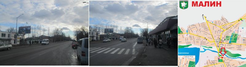 Билборд/Щит по МАЛИН Гагаріна 16 Б. центральна вул. на Житомир.автостанція банк(укрсіббанк.ощадбанк)поліссяпродукт.будмаркет.офісна буд., Малин