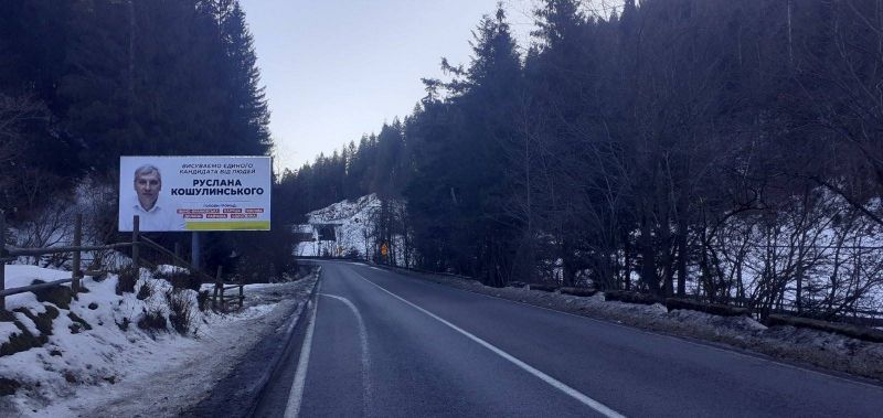 Билборд/Щит по Траса Н-09 Мукачево-Львів, в`їзд у селище, готельны комплекси Срыбны Роси, Микулин Хутырець, напрямок руху на Буковель, Микуличин