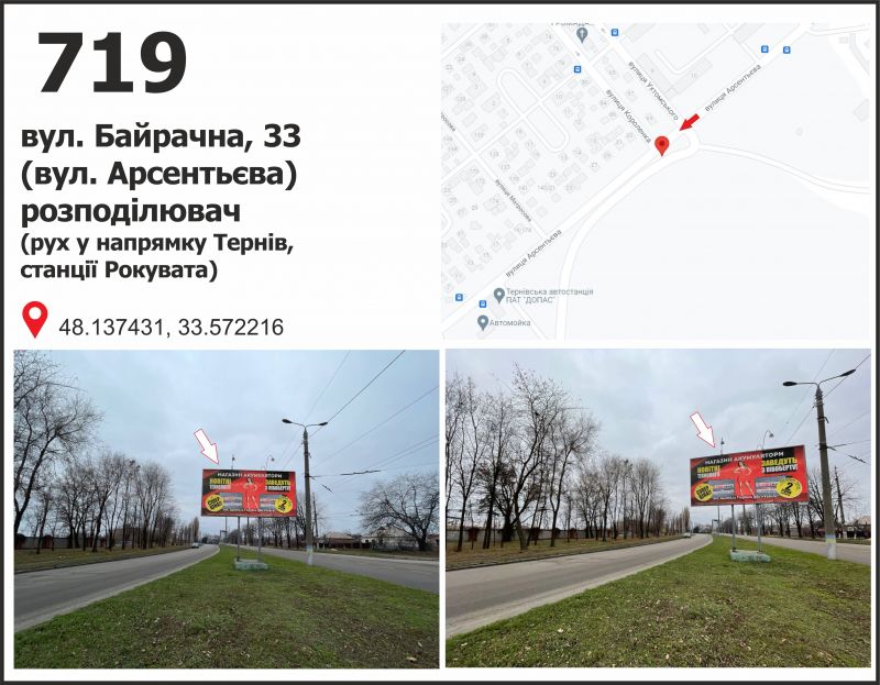Билборд/Щит по вул. Байрачна (Арсентьева), 33, разделитель, дв-е к пл. Труда, Кривой Рог
