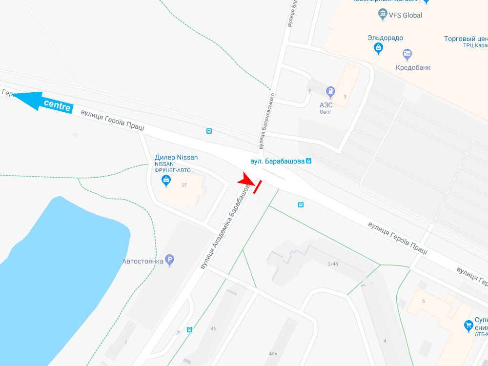 Нескорених (Героїв Праці) вул. - Барабашова вул., ТРЦ, з центру (ТРЦ "Дафі")