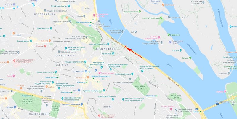 Набережне шосе, 100 м. до Пішохідного Моста, рух в напрямку Поштова пл.