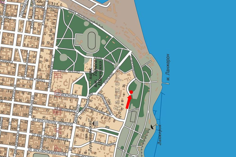 Чорноморська вул., біля ресторану "Хуторок", парку ім. Шевченка, пляж Ланжерон