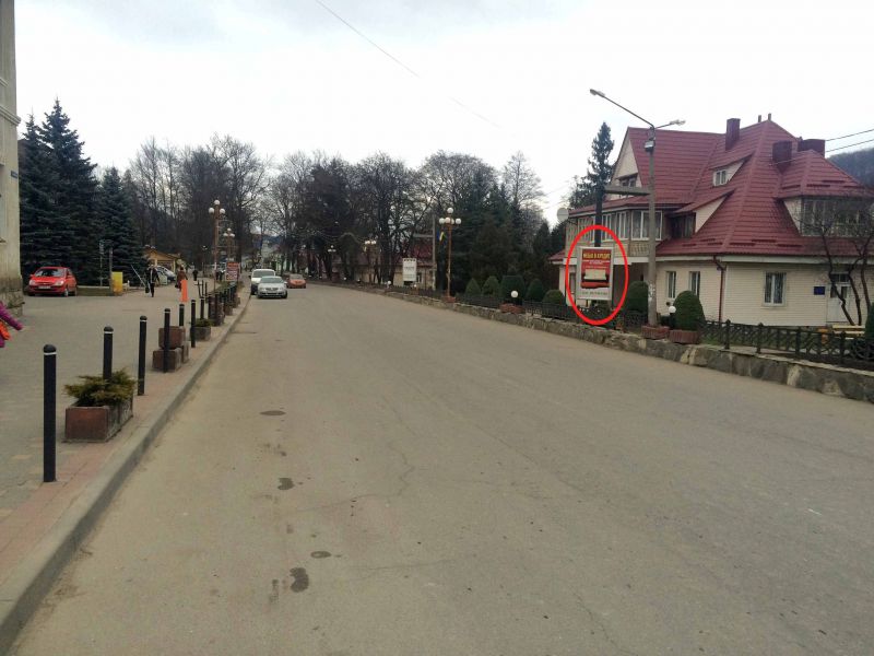 Сітілайт Траса Н-09 Мукачево-Львів, Свободи, біля РАДС, навпроти міської ради, Банк Хрещатик, УкрсоцБанк, напрямок руху на Івано-Франківськ, Яремча
