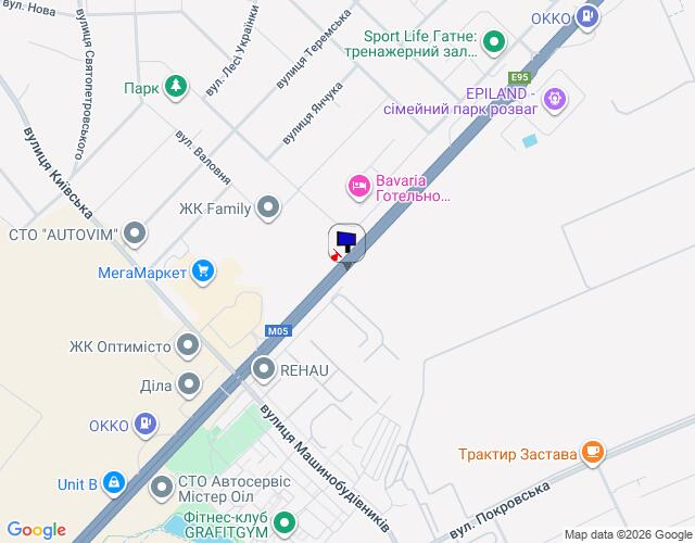 с. Чабани, траса М-05 Київ-Одеса, км 14+625 ліво, за 560м до Нової Лінії та магазину АТБ, через 320м після заїзду у МегаМаркет Гатне, через 465м після повороту на Гатне, Крюківщину, Вишневе та ЖК "Оптимісто", верх