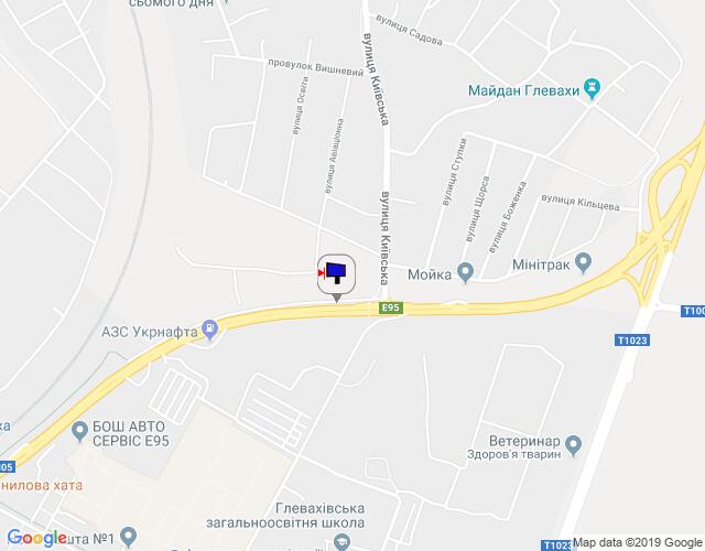 смт. Глеваха, траса М-05 Київ-Одеса, км 27+250 право, виїзд з вул. Київська на Одеську трасу, автобусна зупинка, через 310м після АЗС Укрнафта, за 760м до розв'язки на м. Васильків, низ