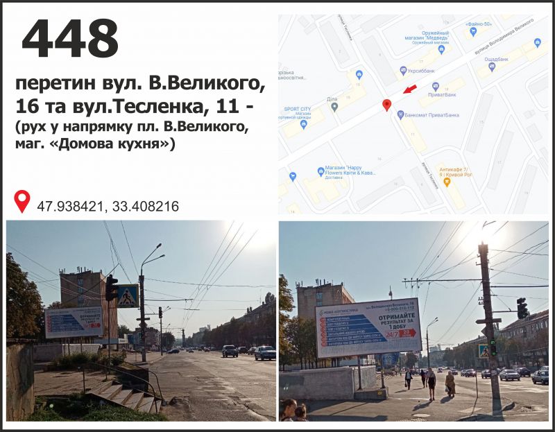 Білборд/Щит вул. Володимира Великого (Мелешкіна), 20 - вул. Тесленко, 11 (маг. "Домова кухня"), рух у напрямку пл. Артема, Кривий Ріг