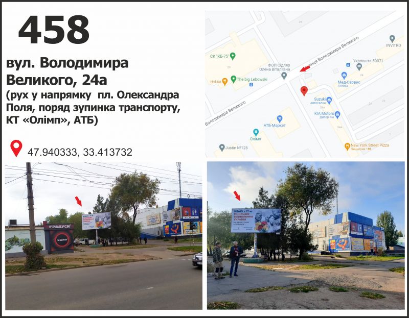 Білборд/Щит вул. Володимира Великого (Мелешкіна), 24а (зуп. "кінотеатр Олімп", СК "Ескоріал"), рух у напрямку пл. Артема, Кривий Ріг
