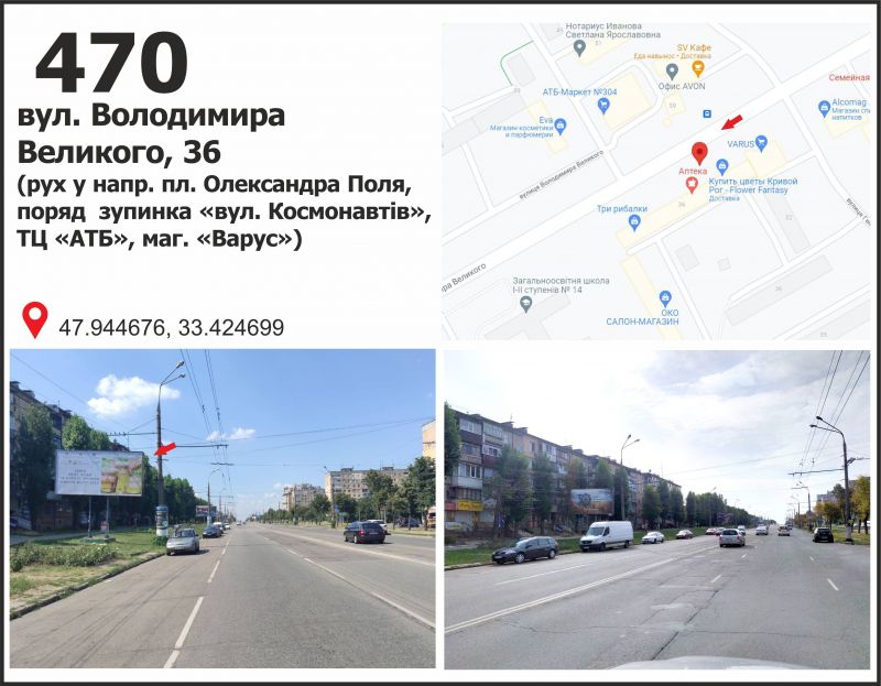 Білборд/Щит вул. Володимира Великого (Мелешкина), 36 (зуп. "вул. Космонавтів", ТЦ "АТБ"), рух у напрямку пл. Артема, Кривий Ріг