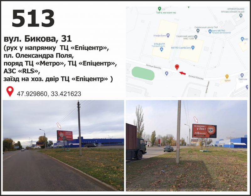 Білборд/Щит вул. Бикова, 31 (ТЦ "МЕТРО", ТЦ "Епіцентр"), рух у напрямку пл. Артема, Кривий Ріг