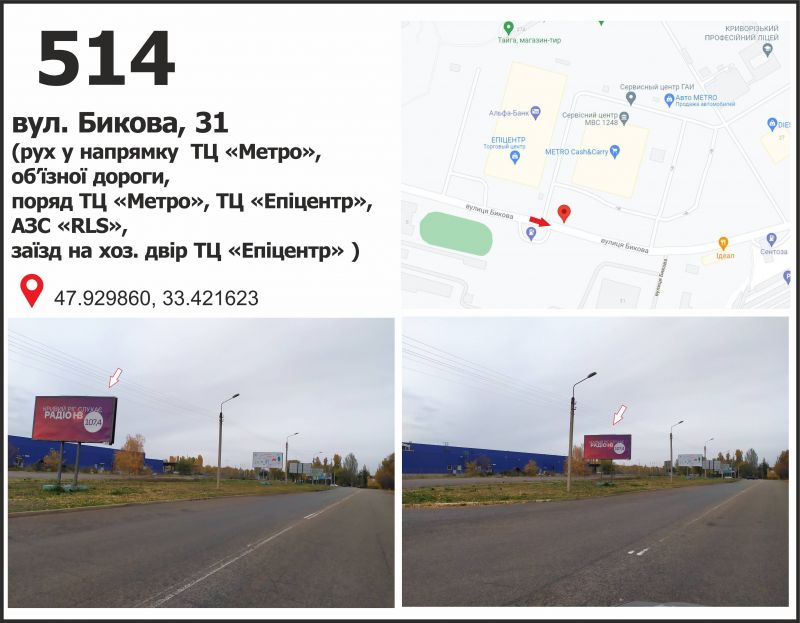 Білборд/Щит вул. Бикова, 31 (ТЦ "МЕТРО", ТЦ "Епіцентр"), рух у напрямку мкр. Східний-1, Кривий Ріг
