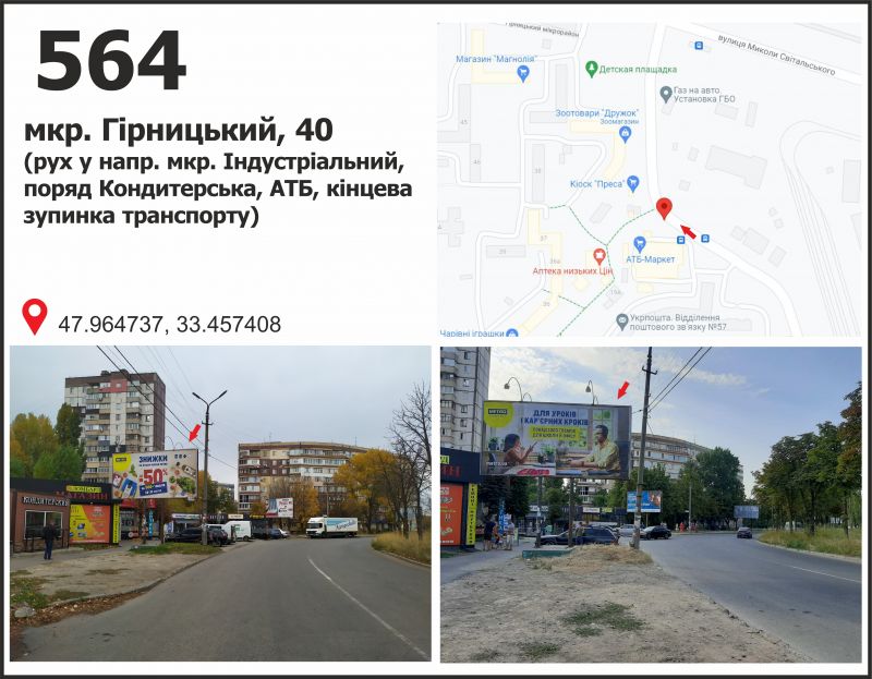 Білборд/Щит мкр. Гірницький, 22а (ТЦ "АТБ", кінцева зуп. МТС), рух в напрямку вул. М. Світальського (Коротченко), Кривий Ріг