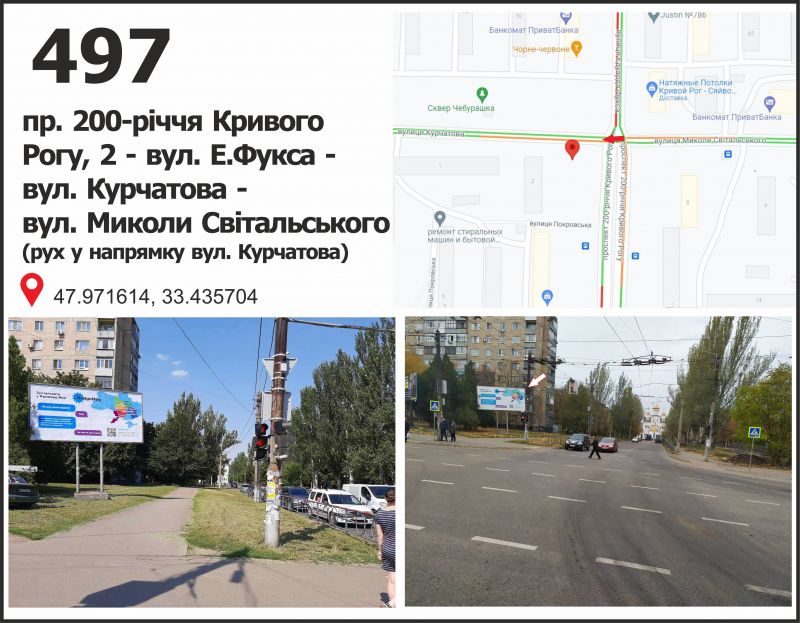 Білборд/Щит пр. 200-річчя Кривого Рогу, 2 - вул. Єдуарда Фукса (Тухачевского) - вул. Миколая Світальського (Коротченко), рух у напрямку пл. 30 років Перемоги, Кривий Ріг