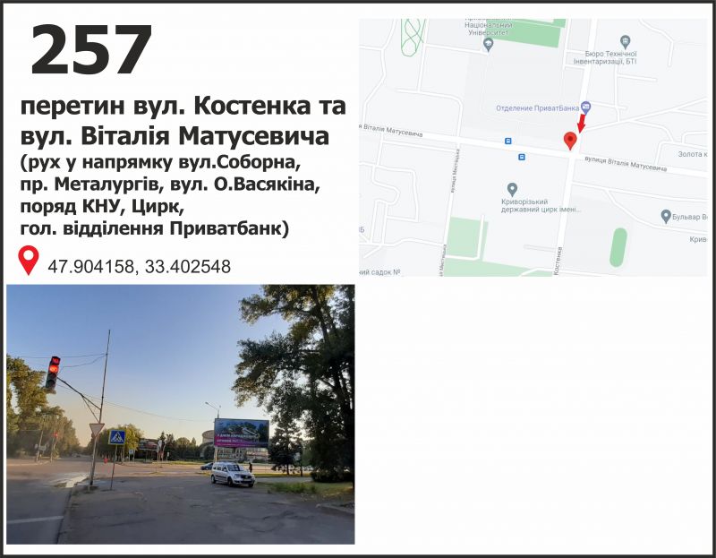 Білборд/Щит вул. Віталія Матусевича (22-го Партсъезда), 11 - вул. Костенка (Приват Банк, КТУ, цирк), рух у напрямку вул. Соборності (Косиора), Кривий Ріг