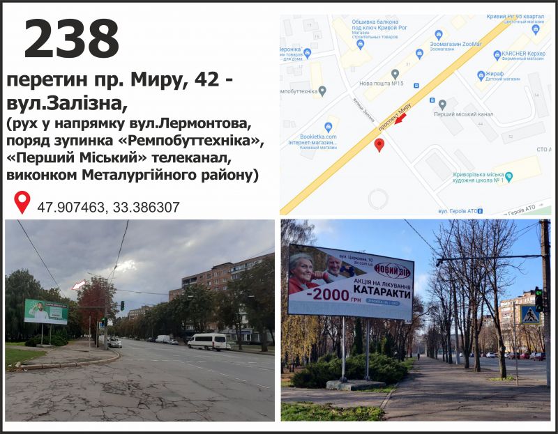 Білборд/Щит пр. Миру, 42 (зуп. "Ремпобуттехніка", Металургійний виконком), рух у напрямку вул. Лермонтова, Кривий Ріг