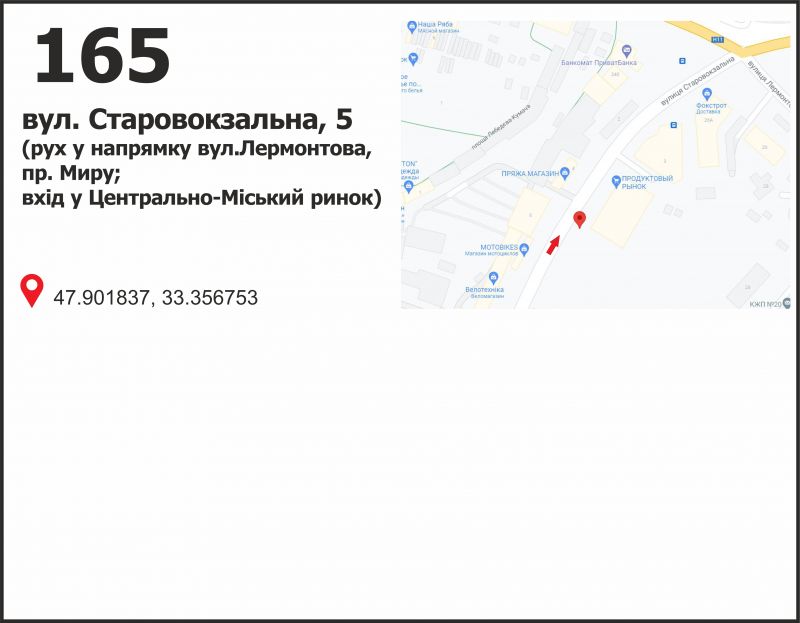 вул. Старовокзальна (Урицкого), 5 (вхід в Центрально - Міський рынок), рух у напрямку вул. Лермонтова, пр. Миру