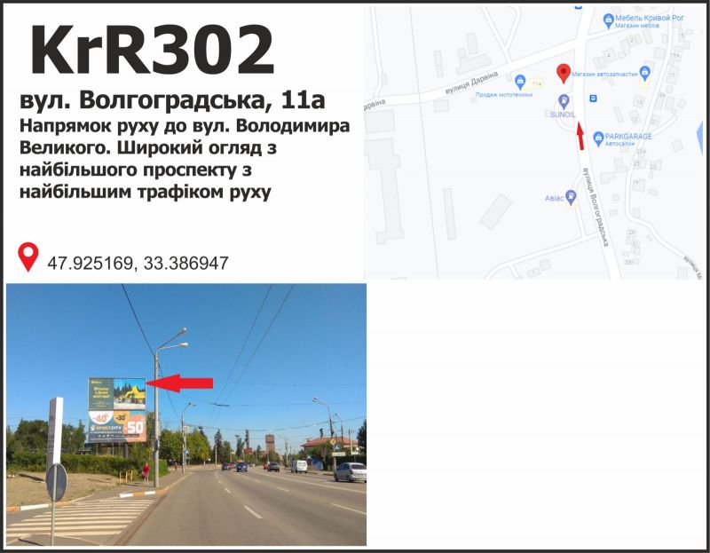 Білборд/Щит вул. Волгоградська, 11А, напрямок руху до вул. Володимира Великого. Широкий огляд з найбільшого проспекту з найбільшим трафіком руху., Кривий Ріг