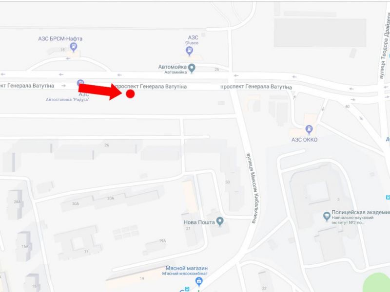 Шухевича пр. (колиш. Ватутіна пр.), 26, навпроти АЗС БРСМ, в сторону Троєщинського ринку, з центру