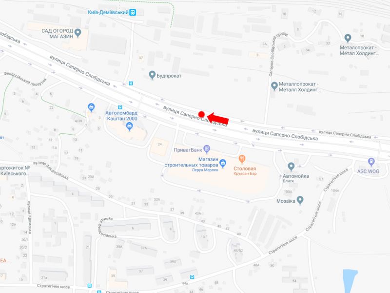 Саперно-Слобідська вул., 26, навпроти супермаркету "Leroy Merlin", на світлофорі, в бік пл. Деміївської