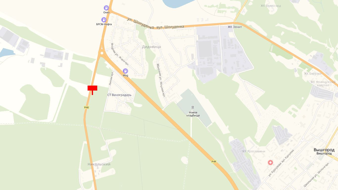 автомобільна дорога Р-02 “Київ-Іванків-Овруч”, 400 м. до повороту на вул. Богатирська, у напрямку з м. Київ у м. Вишгород, праворуч