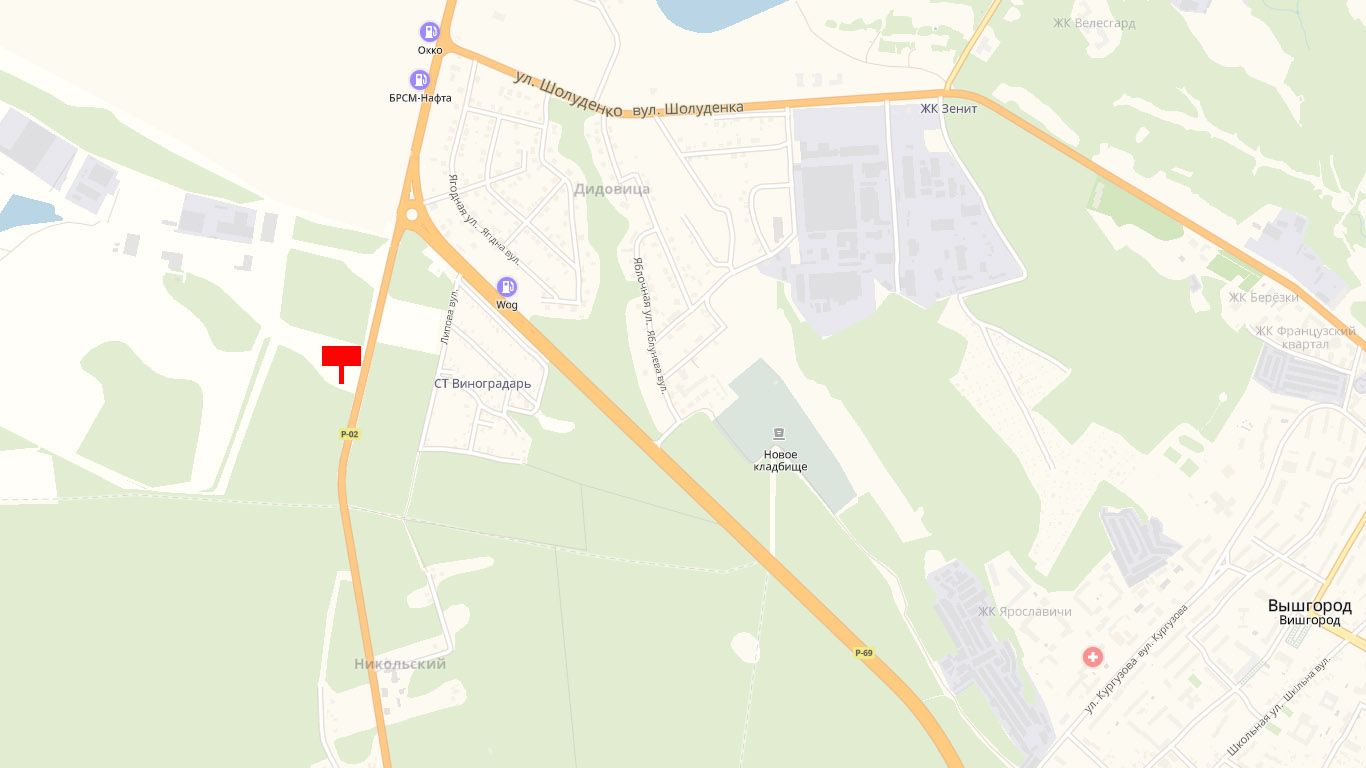автомобільна дорога Р-02 “Київ-Іванків-Овруч”, 200 м. від дорожнього знаку “Вишгород”, у напрямку з м. Київ до м. Вишгород, ліворуч