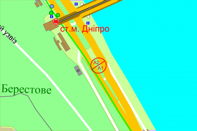 Набережне шосе (розподілювач, 100 метрів до мосту Метро, рух в напрямку мосту Патона)