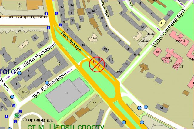 Басейна вулиця 19, (розподілювач), ТРЦ "Гулівер" в напрямку до вул. Хрещатик