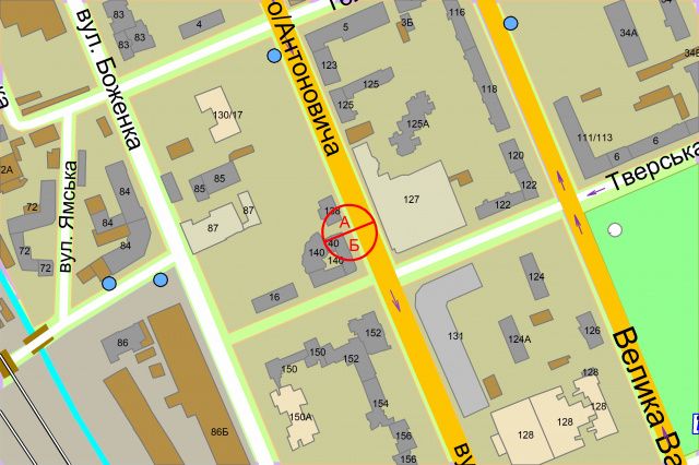 Антоновича вул.,140/Єжі Гедройця вул., 250 м.від Володимирського ринку, рух в нарямку ст. метро "Либідська"