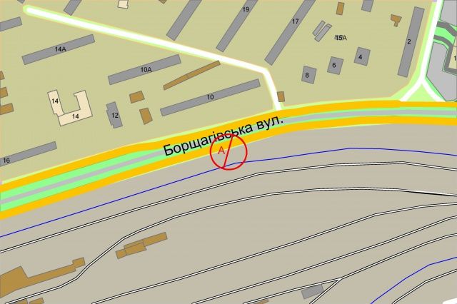 Борщагівська, навпроти буд. 10 (рухаючись до центру міста)