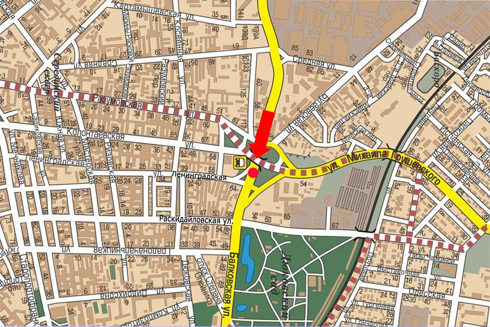 Балківська вул. 54 / Грушевського вул., роздільник, від мосту, АЗС "Катрал" в центр, ліва