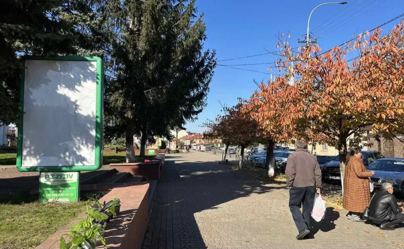 Сітілайт вул. Незалежності, центр міста, біля Ексім банку, напроти продуктового магазину та редакції Дружба, масове скупчення людей, Тячів