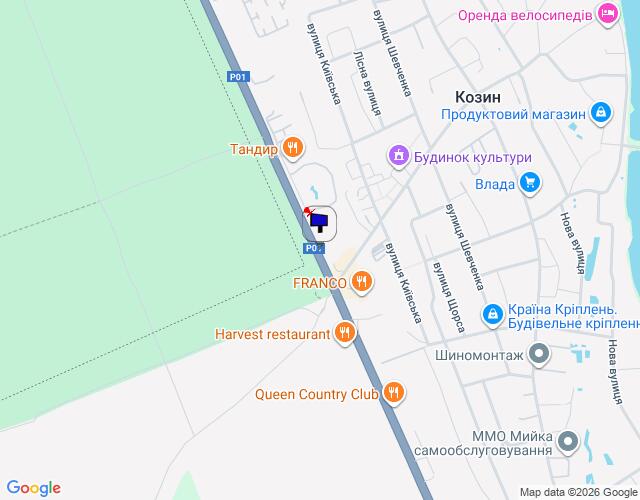 Конча-Заспа, траса Р-01, с. Козин, км 29+700 ліво, за 100 м до автобусної зупинки, 150 м до повороту на вул. Партизанська